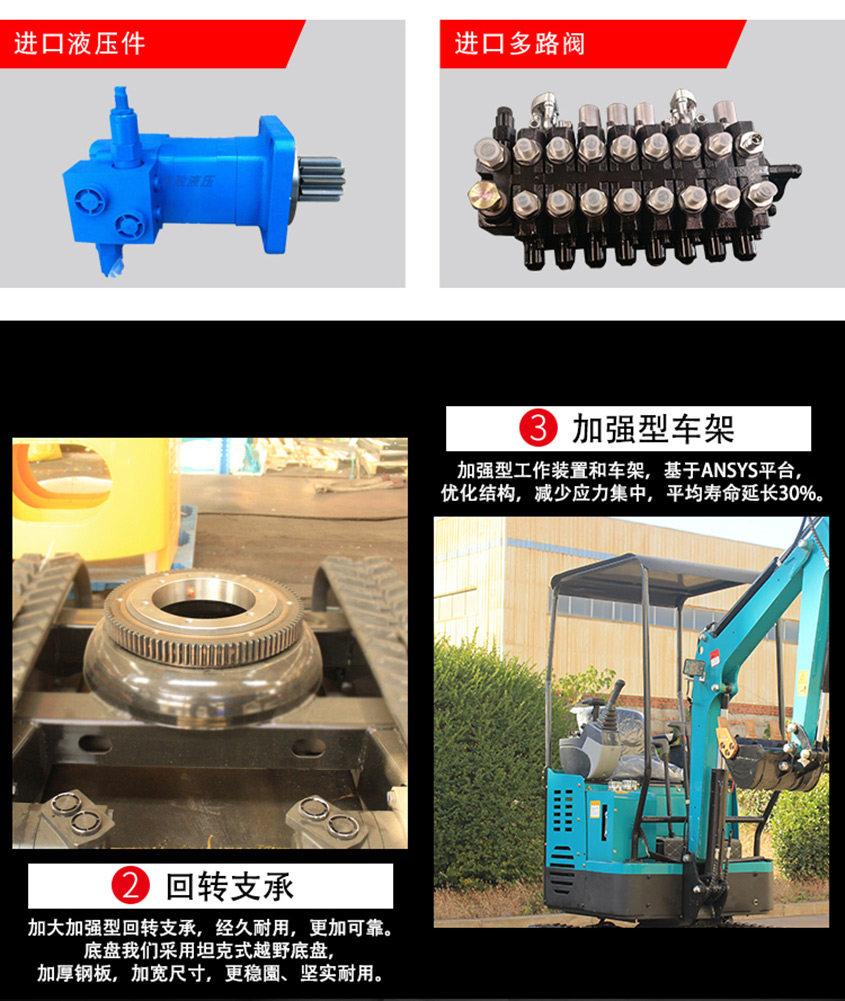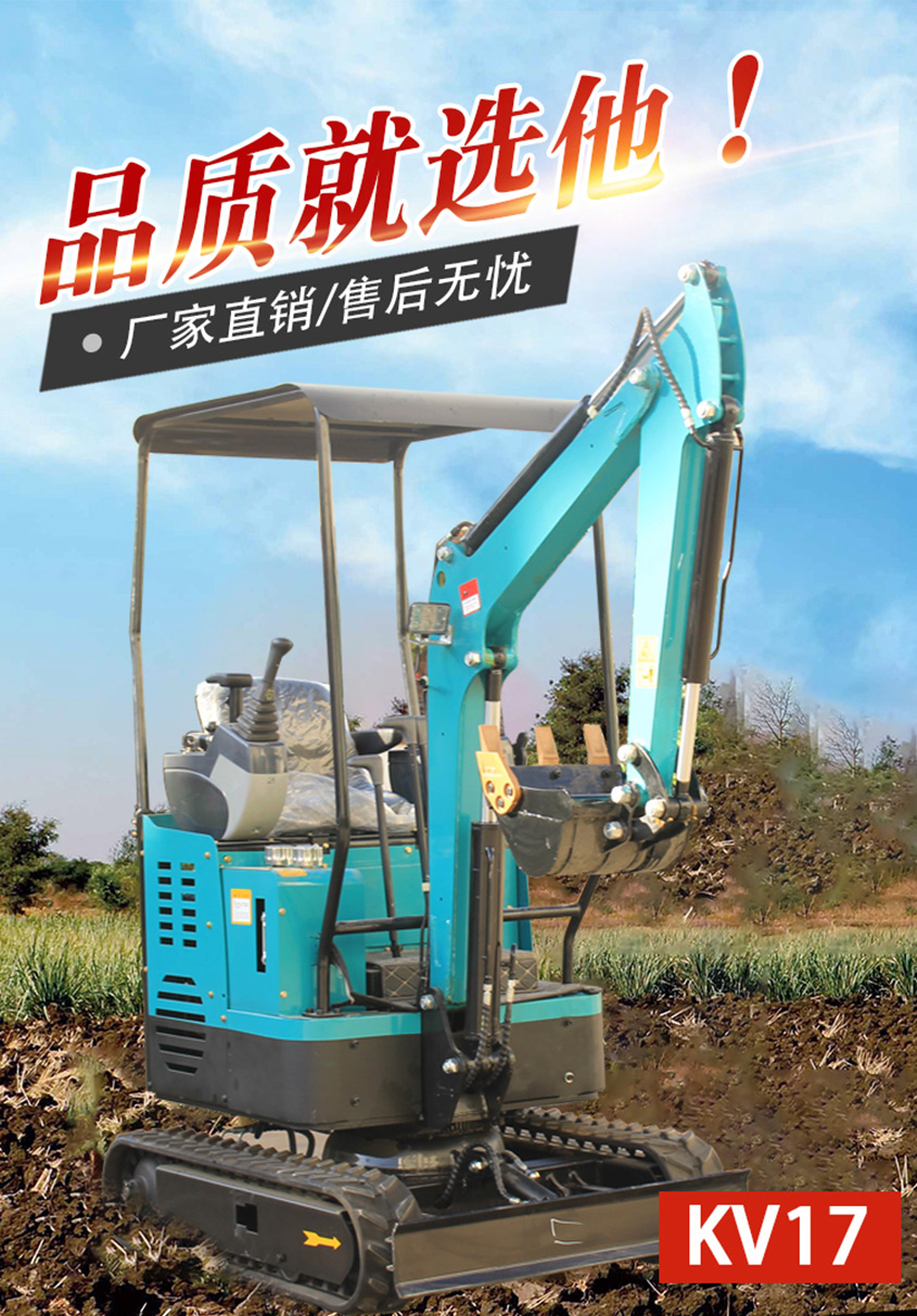 KV17小型挖掘機自主設計、外觀漂亮、配置高、性能優越、油耗低、作用范圍廣 ,適合蔬菜大棚的土地疏松,市政府部門的園林綠化、果園苗圃栽樹挖坑,混凝土路面破碎, 砂石料攪拌,空間狹小的施工作業等。適用快